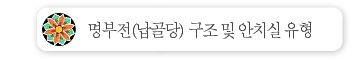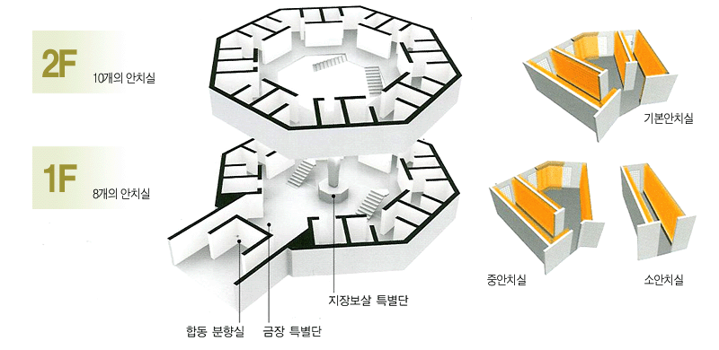 [±âº»¾ÈÄ¡½Ç] ¸íºÎÀüÀÇ ±âº»ÀÌ µÇ´Â ¾ÈÄ¡½Ç·Î½á 1Ãþ¿¡ 6½Ç, 2Ãþ¿¡ 6½Ç ¸ðµÎ 12½ÇÀÌ ÀÖ½À´Ï´Ù. ±âº»¾ÈÄ¡½Ç¿¡´Â ÃÑ 1,214À§ÀÇ ¿µ°¡¸¦ ¸ð½Ç ¼ö ÀÖ´Â °³Àδܰú ºÎºÎ´Ü ±×¸®°í °¡Á·´Ü µîÀ¸·Î ±¸¼ºµÇ¾î ÀÖ½À´Ï´Ù. °ø°£°ú °ø°£»çÀÌ¿¡´Â 䱤âÀÌ ÀÖ¾î¼ ³·¿¡´Â ÀºÀºÇÑ ºûÀÌ ³»ºÎ¸¦ °ñ°í·ç ºñÃçÁÝ´Ï´Ù. ¸íºÎÀüÀÇ ¾ÈÄ¡½Ç Áß °¡Àå ³ÐÀº °ø°£À» °¡Áö°í ÀÖÀ¸¸ç Å©°Ô ¼¼°³ÀÇ °ø°£À¸·Î ³ª´©¾î Áý´Ï´Ù. º¹µµ °ø°£Àº µÎ»ç¶÷ ÀÌ»óÀÌ °°ÀÌ µé¾î°¡µµ ¿©À¯·Ó½À´Ï´Ù.